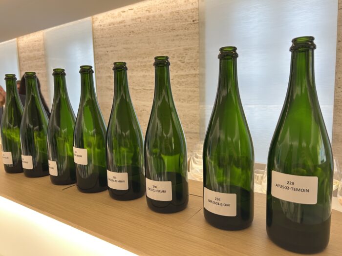 Climate change is tangible here, with earlier ripening, changing aromas and extreme frost, hail and rain. This is impacting yield and quality across Champagne. Herbicide use had deterioriated and compacted the soil, affecting plant fertility. Perrier-Jouët are investigating whether rebuilding soil health can build the vine’s resilience to climate shock, securing wine quality, while ensuring they continue to express the identity of their wines. The intention is to inspire their neighbours to try to the same, to build confidence that it is possible. Communication is very important, with local people and growers supplying grapes.