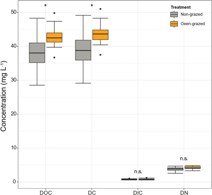 Dissolved Organic Carbon (DOC), Dissolved Carbon (DC), Dissolved Inorganic Carbon (DIC) and Dissolved Nitrogen (DN) content in mg L-1 in non-grazed and oxen-grazed sites (n = 15). Asterisks over to the boxes indicate statistically significant differences between treatments assessed by Student´s t-test (* = p < 0.05; ** = p < 0.01; *** = p < 0.001). If no significant difference was detected n.s. is displayed.