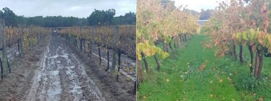 The image presented here is taken from the report, and shows two vineyards 1km apart photographed on the same day, one cultivated 8 times in the growing season, the other with direct drilled cover crop.
