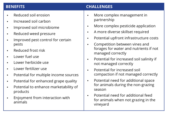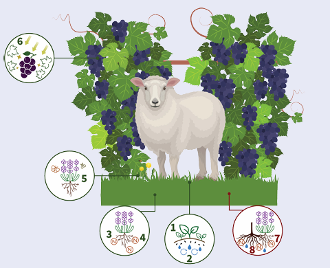 management - Slight competition for water and nutrients can reduce vegetative growth, which helps keep a balanced canopy to allow more sunlight to reach grape clusters. Grazing can help control this balance by limiting forage growth